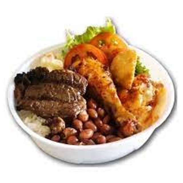 BAIAO, MACARRAO, FAROFA, BATATA DOCE E SALADA, DOIS TIPOS DE CARNES.